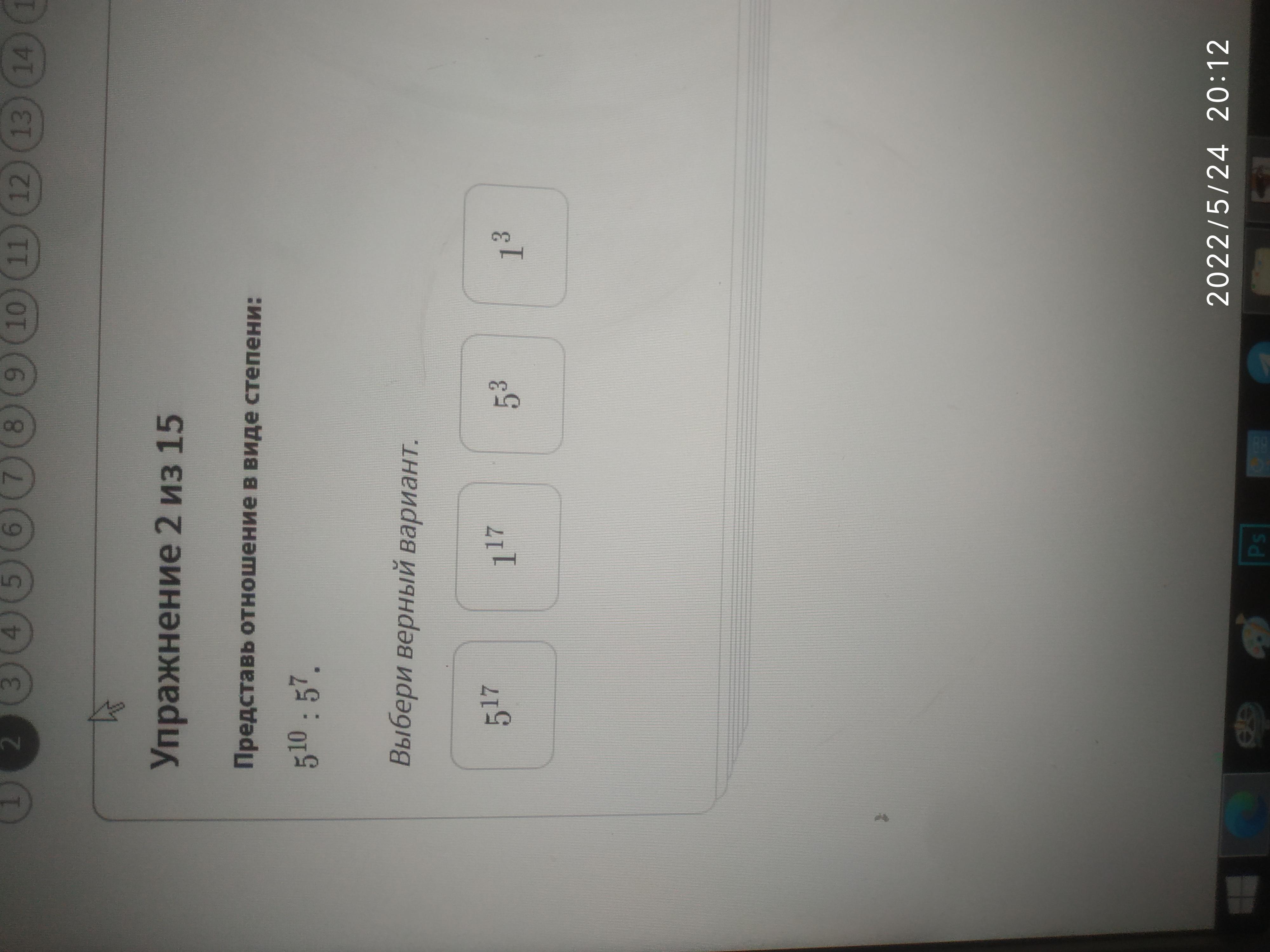 5^3. Т.к, когда одинаковые числа делятся, степени вычитаются: 5^10/5^7 = 5^3