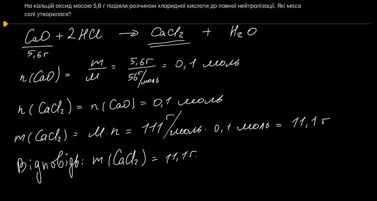 На кальцій оксид масою 5,6 г подіяли розчином хлоридної кислоти до повної нейтралізації. Які маса солі утворилася?