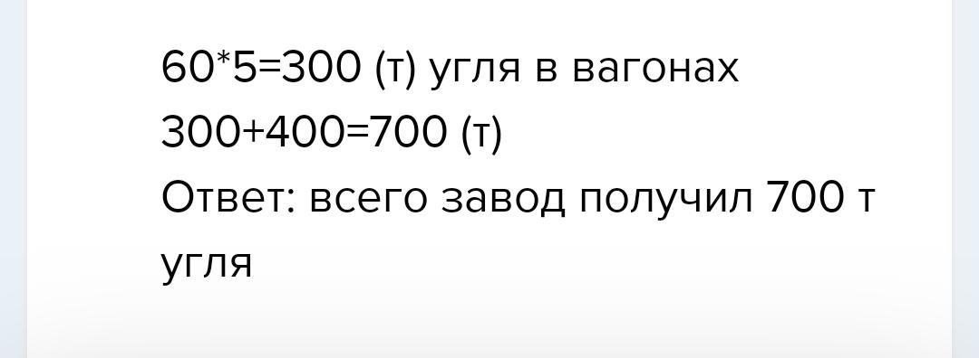 Завод получил 5 вагонов угля по 60 т в каждом и ещё 400 т угля.Сколько всего тонн угля получил завод?