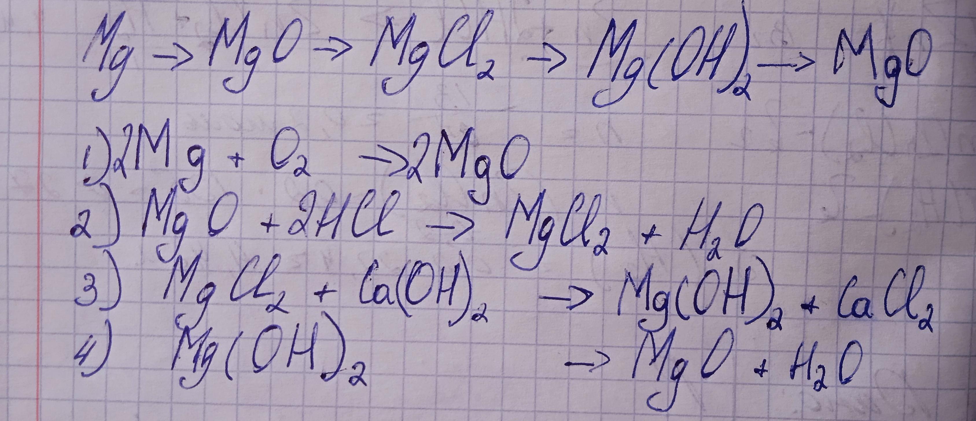 Здійсніть ланцюжок наступних перетворень, знайди речовину Х: Mg → MgO → MgCl2 → Х → MgO. Назвіть речовину (назву писати з маленької літери, назва складається з двох слів )