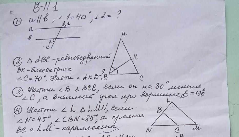 2) треугольник равнобедренный значит углы при основании B и C равны, известен угол С тогда угол BB равен 70 градусов, а угол А 180-(70+70)=40 градусов так как ВК биссектриса то уголАВК равен 35 градусам и угол АКВ равен 180-(35+40) =105 градусам