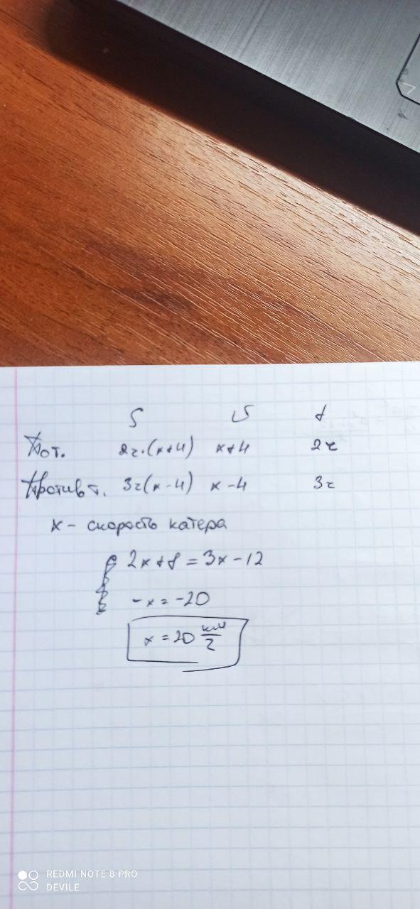 Прогулочный катер проходит по течению реки столько же, сколько против течения за 3 часа, но затратив на этот Путь на 1 час меньше. Найди собственную скорость прогулочного катера, если скорость течения реки 4км/ч.