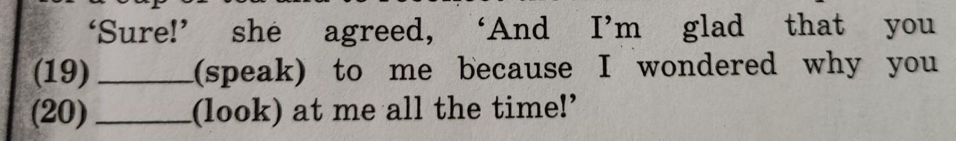 (19) 'Sure!' she agreed, 'And I'm glad that you (speak) to me because I wondered why you (look) at me all the time!" (20)
