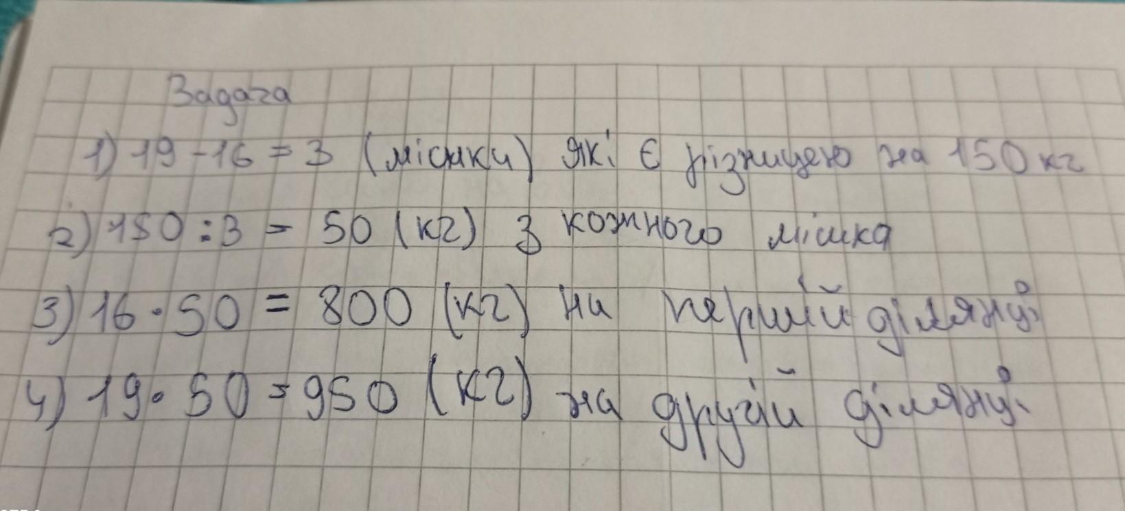 Розв'яжи задачу і надрукуй дії. З однієї ділянки зібрали 19 мішків моркви, а з Другої - 16. Із першої ділянки зібрали на 150 кг більше, ніж з другої. Скільки кілограмів моркви зібрали з кожної ділянки окремо? / 3 баллов