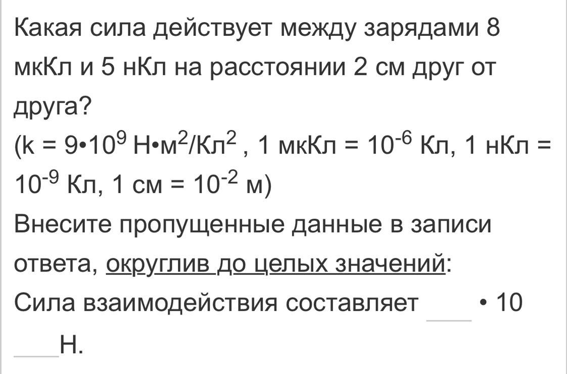 Fк = (9*10^9 * |8*10^-6| * |5*10^-9|) / (2*10^-2) = (9*8*5 / 2) * 10^(9-6-9+2) =
