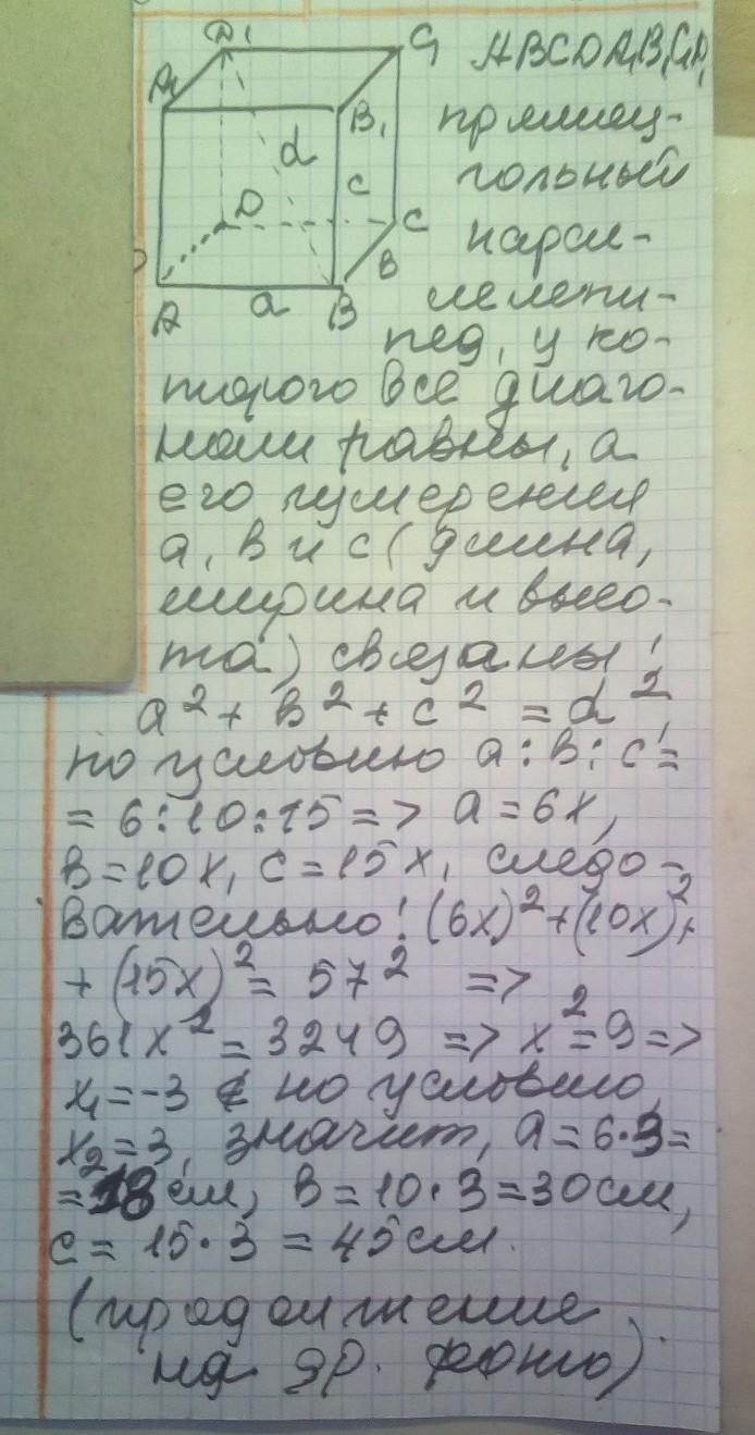 Довжина діагоналі прямокутного паралелепіпеда – 57 см, його розміри відносяться як 6:10:15. Визначте площу повної поверхні паралелепіпеда.