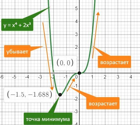 Будь ласка, допоможіть!!!Потрібно сьогодні!!! Знайдіть проміжки зростання, спадання і точки екстремуму фукнції f(x)=x^4+2x^3. Зразу дякую <3