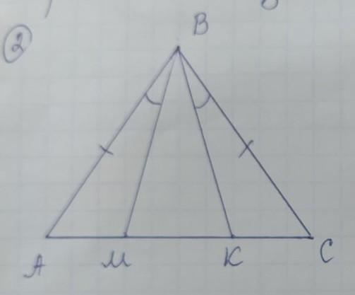 2) АВ=АС , кут АВМ = куту КВС - умова, кут ВАС= куту ВСА з 1) → трикутники АВМ і КВС рівні за другою ознакою рівності трикутників → відповідні елементи трикутників рівні а отже якщо МВ=ВК то трикутник МВК- рівнобедрений а це те що і потрібно було довести.