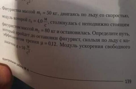 ДАЮ 100 БАЛЛОВ!!!! Фигуристка массой m1=50 кг, двигаясь по льду со скоростью, модуль которой v0=4 м/с, столкнулась с неподвижно стоящим фигурист ом массой m2=80 кг и остановилась. Определите путь, который пройдёт до остановки фигурист, скользя по льду с коэффицентом трения 0,12. Модуль ускорения свободного падения g=10 м/с²