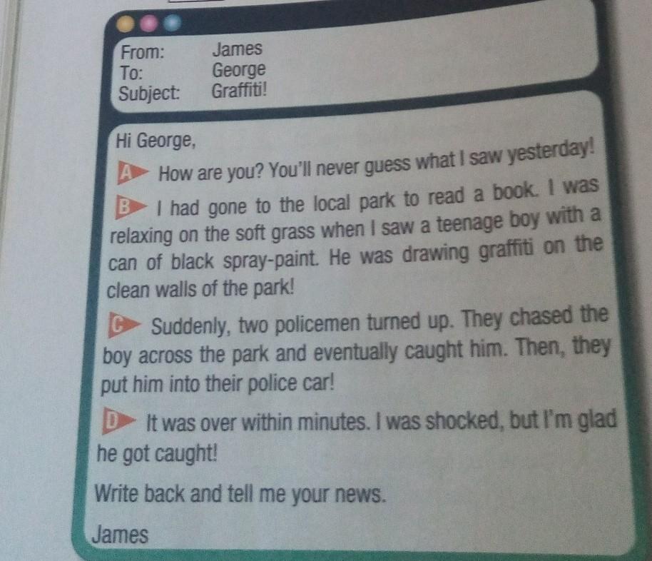 СРОЧНО ПОМОГИТЕ ДАМ 50 1 Read the rubric, then read the email and match the paragraphs to the headings. You were in the park when you saw someone drawing graffiti. Write an email to your English friend telling him what you saw, and how you felt (50-100 words). 1 FEELINGS WHAT HAPPENED IN THE END OPENING REMARKS PLACE AND EVENTS 23 4