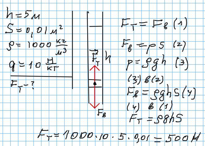 Водостічна труба двохповерхового будинку заввишки 5м засмітилася біля нижнього кінця так, що вода через корок, що утворився , зовсім не протікає. Якою є мінімальна сила тертя корка о трубу, якщо відомо що площа корка дорівнює 0,01м²? Густина води 1000 кг/м³, прискорення вільного падіння g = 10 Н/кг. Відповідь дайте у ньютонах.