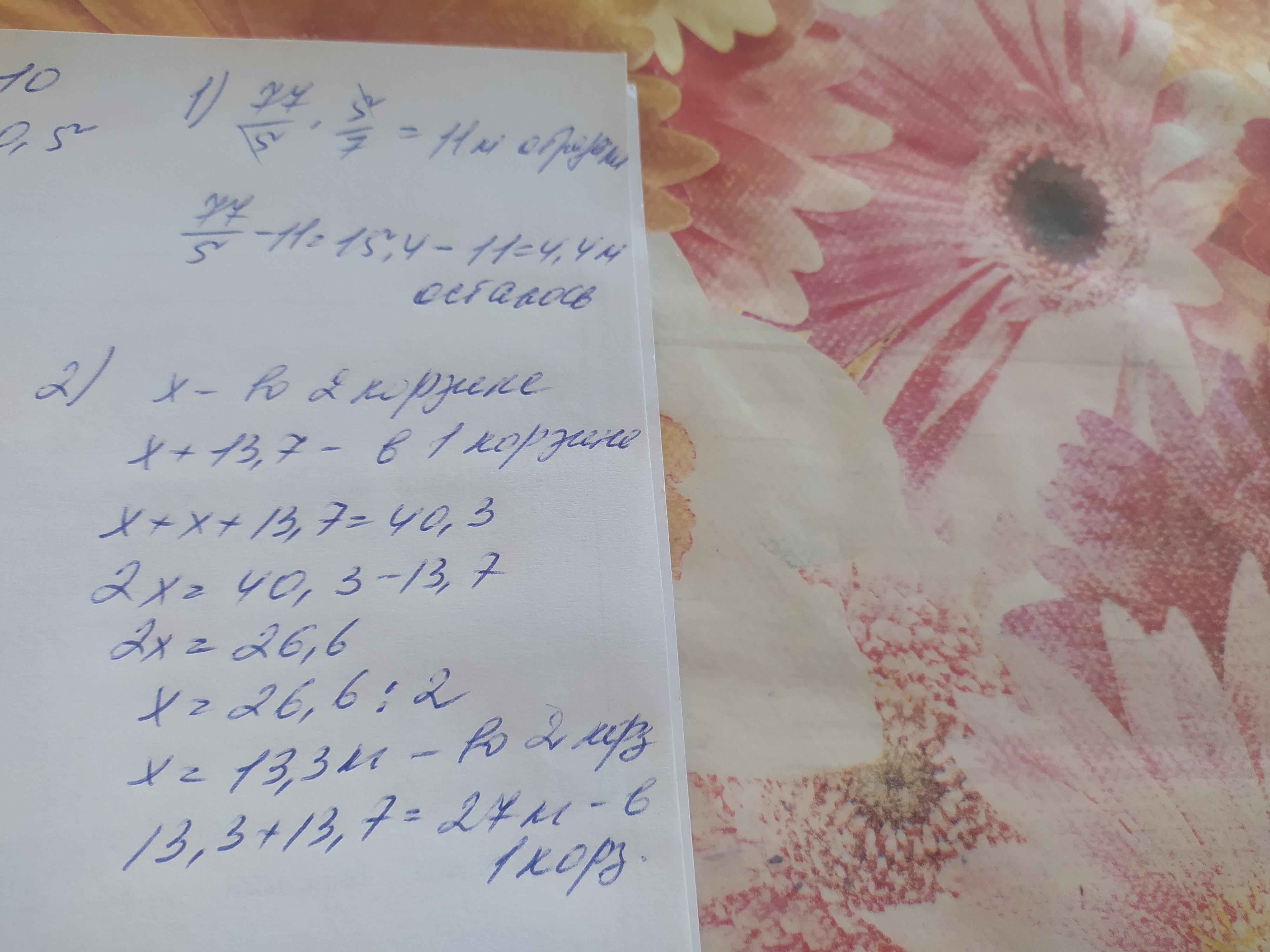 1) 77/5 * (5/7)=(77*5)/(5*7)=11м; 77/5-11=77/5-55/5=22/5=4 2/5=4,4м; 2) х+(х+13,7)=40,3; 2х+13,7=40,3; х=13,3; (х+13,7)=13,3+13,7=27;
