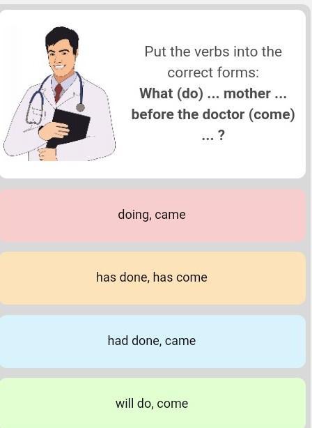 ;) Put the verbs into the correct forms: What (do) ... mother ... before the doctor (come) ...?Помогите Пж УМОЛЯЮ ПОМОГИТЕ даю 30 балов