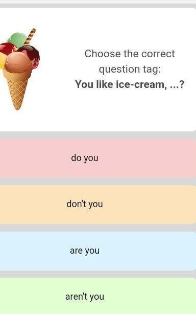 Choose the correct question tag: You like ice-cream, ...? УМОЛЯЮ ПОМОГИТЕ даю 50 балов