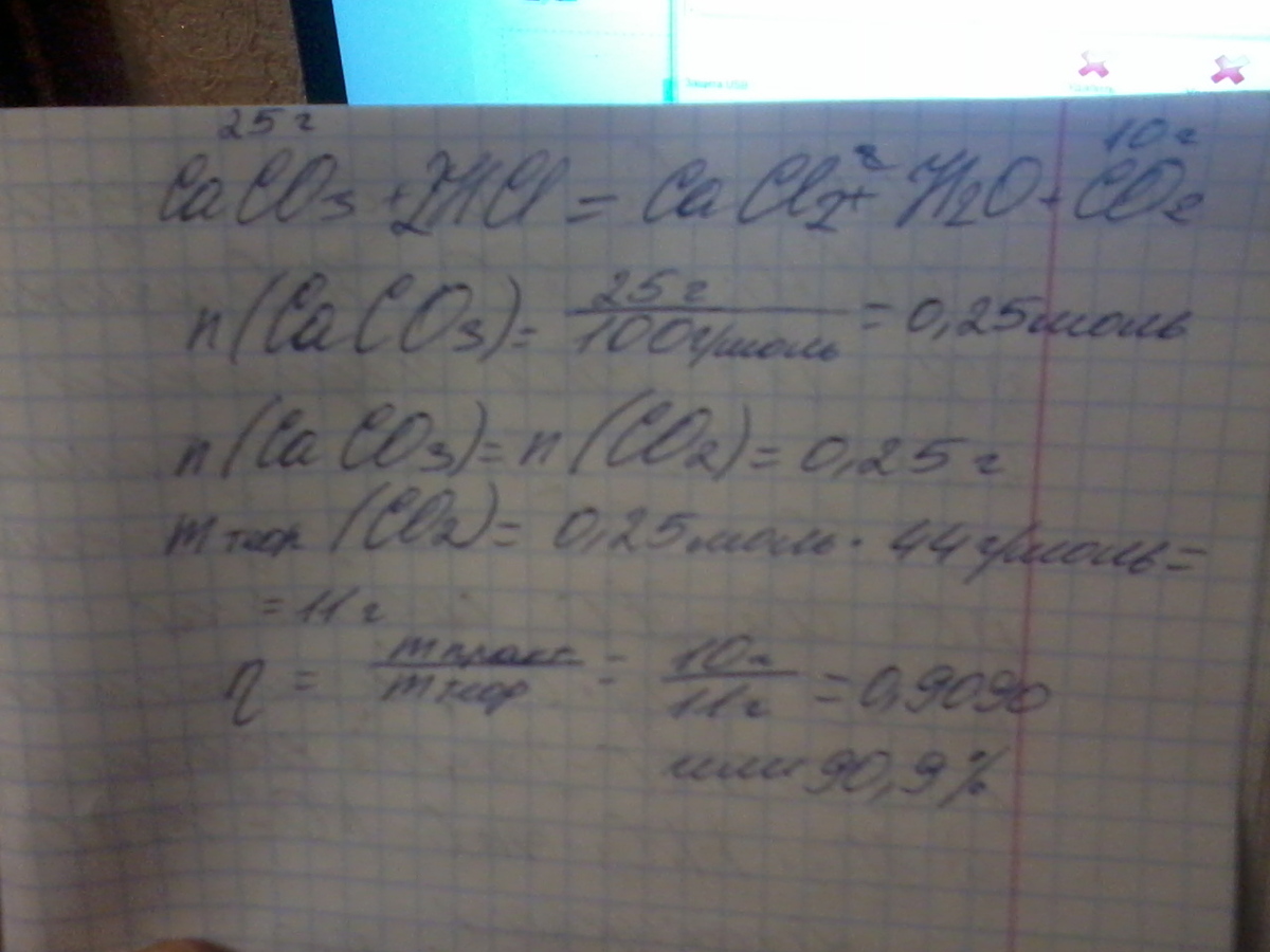 При действии избытка соляной кислоты на карбонат кальция массой 25г. получили оксид углерода 4 массой 10г. Определите выход продукта.