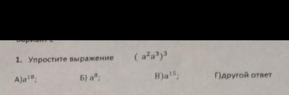 (а²а³) ³= а^(2+3*3) = а^15 - ответ B