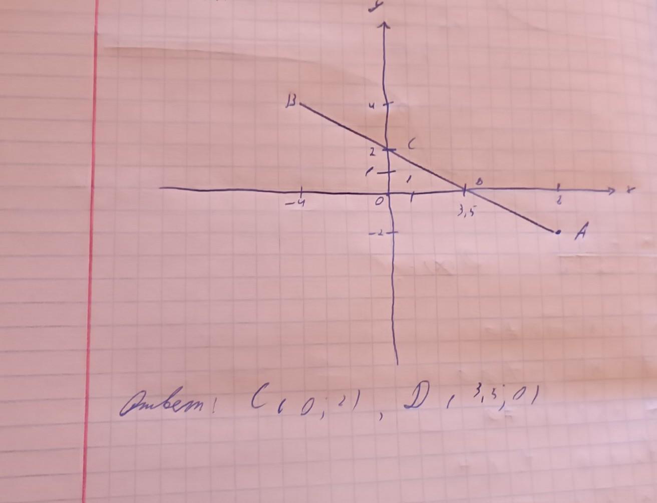 Постройте в прямоугольной системе координат отрезок AB, где А (8;-2), В (-4;4). Найдите координаты точек пересечения этого отрезка с осями координат.