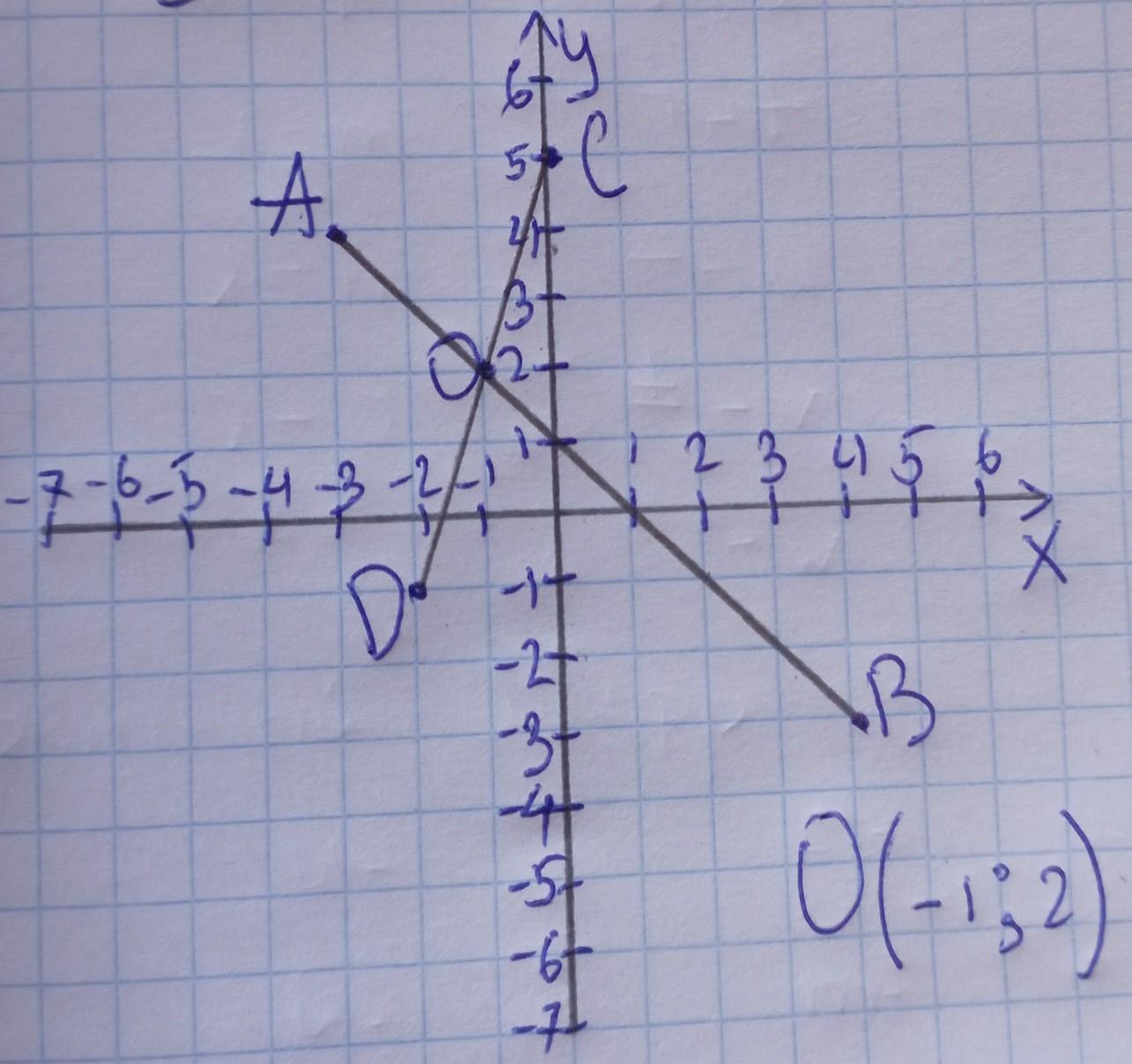 позначте на координатній площині точки а (-3; 4) в(4 ;-3) c (0;5) d (-2 -)1 проведіть відрізки ab і cd знайдіть координати точки перетину цих відрізків, помогите пожалуйста!