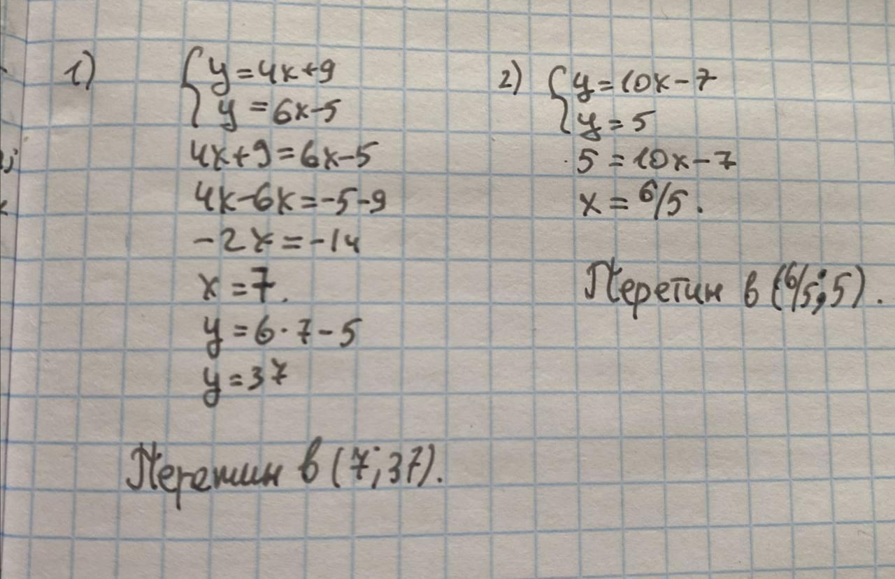 4. Не виконуючи побудови, знайдiть координати точки перетину графiкiв лiнiйних функцій: 1) y = 4х + 9 та у=6x-5; 2) y=10х-7 та у = 5.