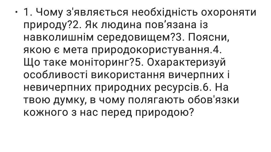 1. Тому, що ми її забруднюємо, а сама себе охороняти не може 2. Без нього людина б не жила 3. Зробити життя кращим, легшим 4. система постійного спостереження за явищами і процесами 5. Вичерпних-часто закінчуються, не завжди є. Невичерпні-завжди є, легко знайти 6. охороняти і спостерігати за нею