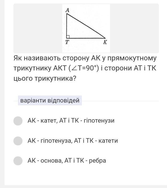 Як називають сторну AK у прямокутному трикутнику AKT (T=90)і сторни AT і TK цього трикутник