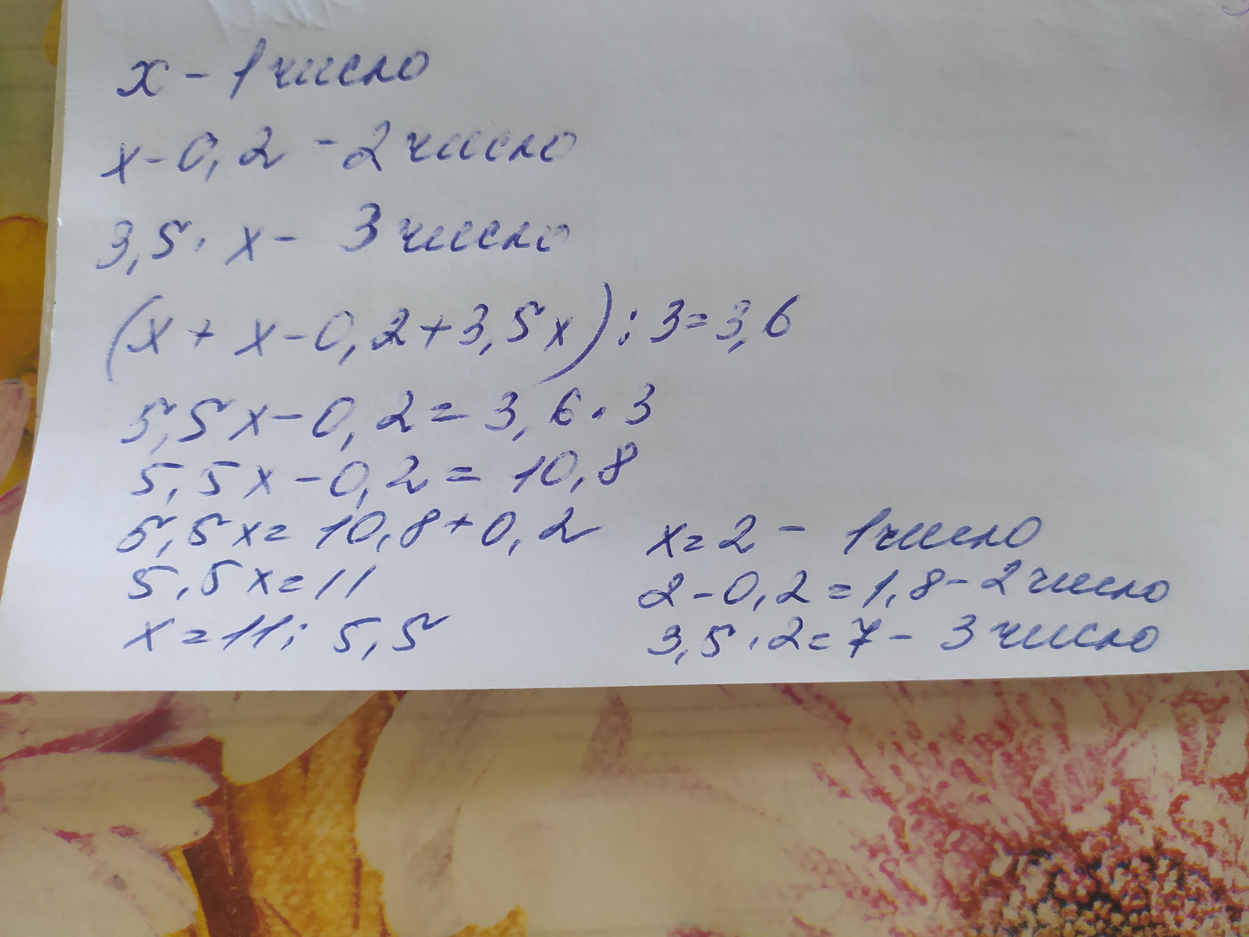 Среднее арифметическое 3 чисел равна 3.6 второе число на 0.2 меньше первого, а третие число в 3.5 раза больше первого числа. Чему равно третие число?