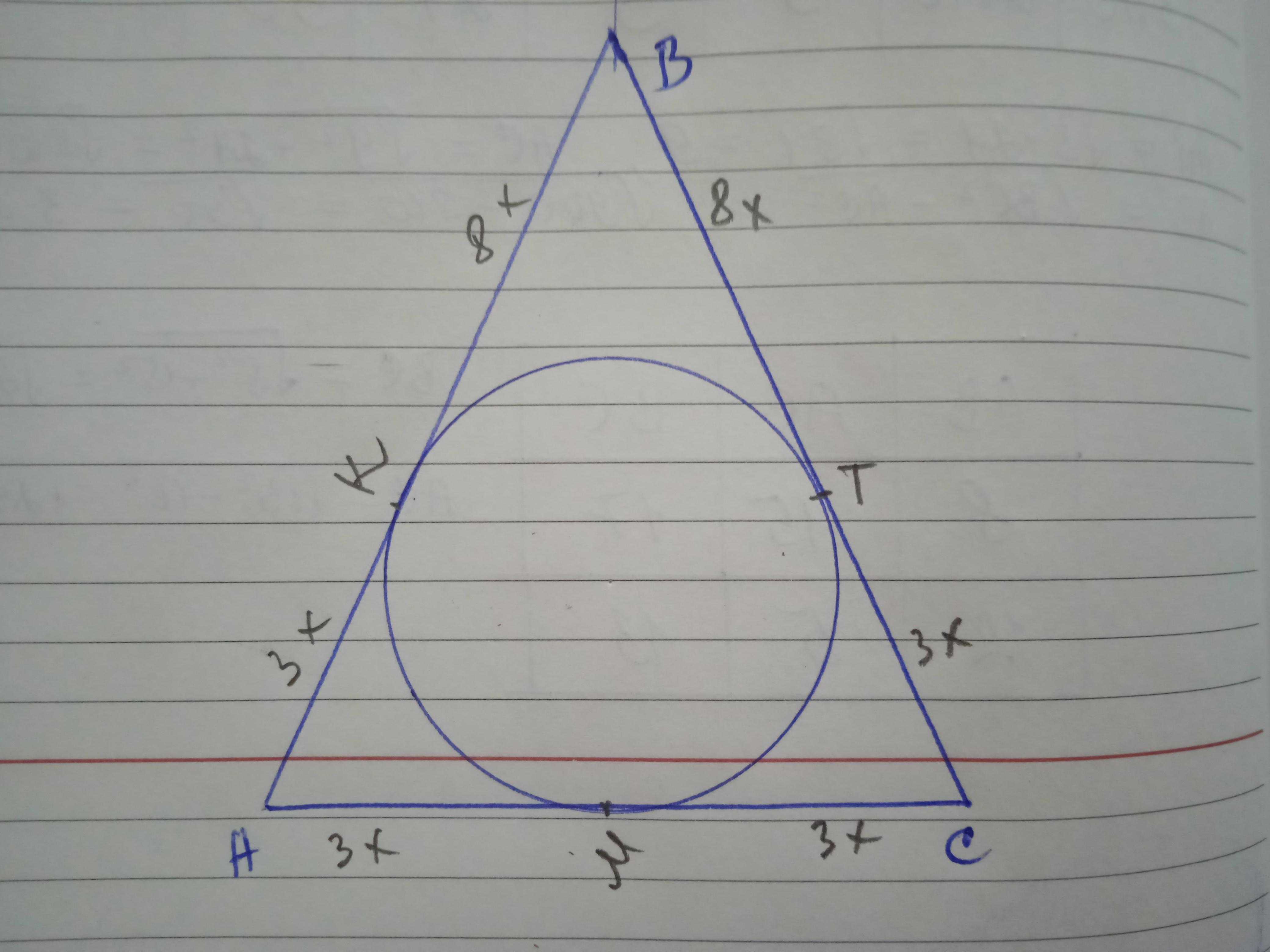 АК=3х см, ВК=8х см, тоді АК=АМ=СМ=СТ=3х см, ВК=ВТ=8х см.