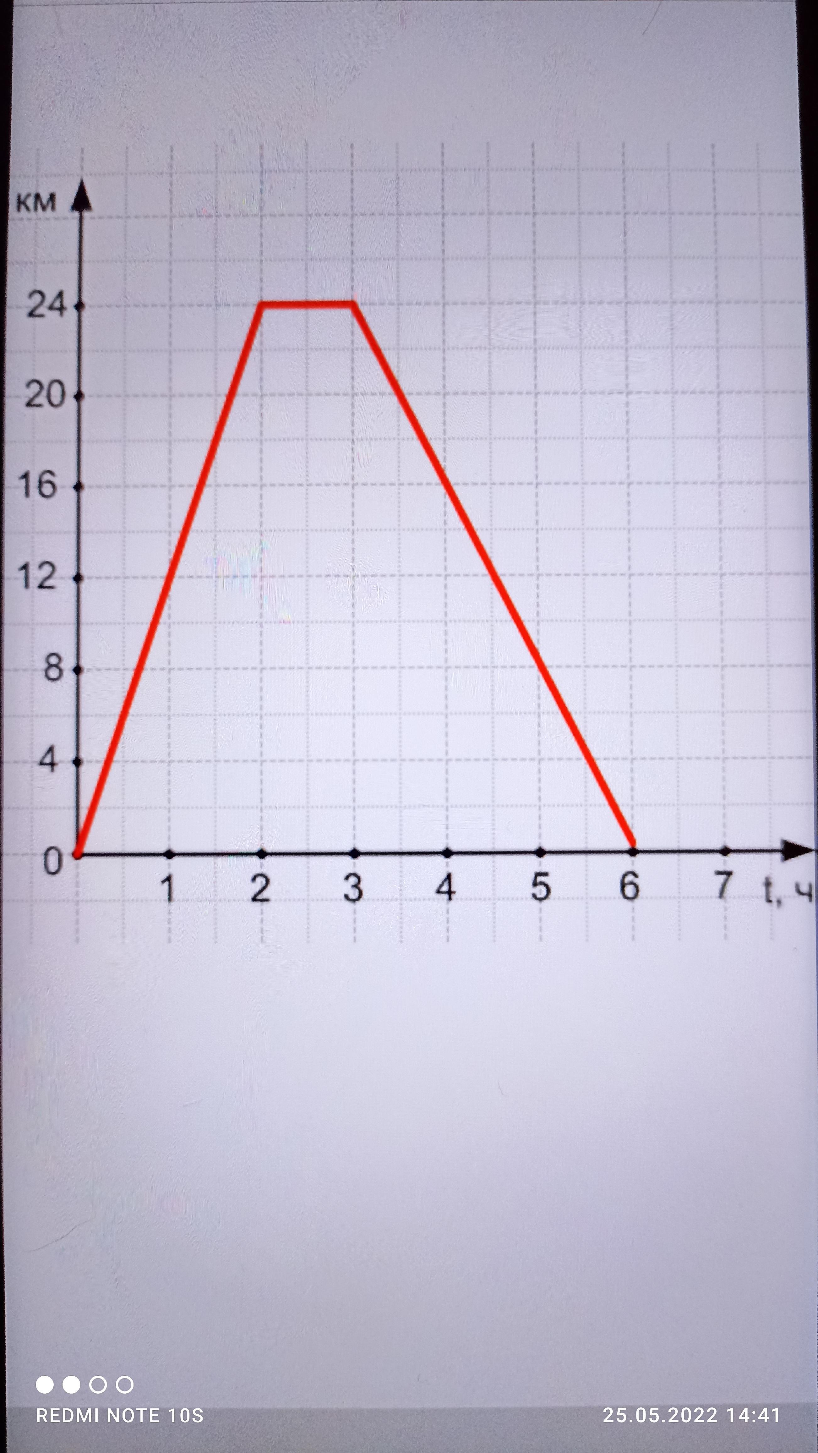На малюнку зображено графік руху туриста. На осі абсцис відкладено час t (у год), а на осі ординат - відстань туриста від табору S (у км). Яка швидкість туриста на зворотному шляху?