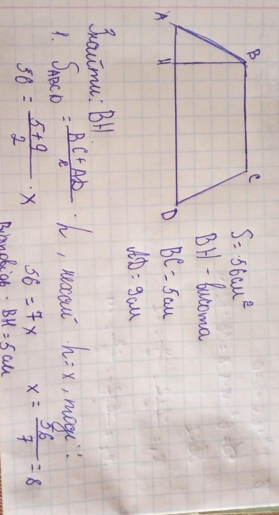 Площа трапеції дорівнює 56 см², а її основи - 5 см і 9 см. Знайдіть висоту трапеції.