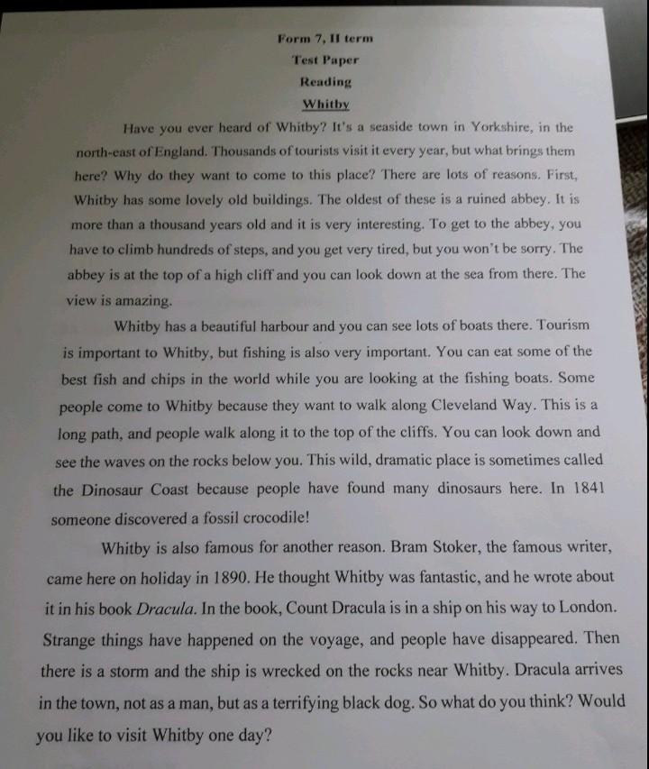 Ви коли-небудь чули про Вітбі? Це приморське містечко в Йоркширі, на північному сході Англії. Щорічно його відвідують тисячі туристів, але що їх сюди приводить? Чому вони хочуть прийти сюди? Є багато причин. По-перше, Віті має кілька чудових старих будівель. Найстарішим з них є зруйноване абатство. Йому більше тисячі років і він дуже цікавий. Щоб потрапити до абатства , треба пройти сотні сходинок , і дуже втомишся , але не пошкодуєш . Абатство знаходиться на вершині високої скелі, і звідти можна дивитися на море. Краєвид дивовижний. У Уітбі є гарна гавань, і там можна побачити багато гавань. Туризм важливий для Вітбі, але рибалка також дуже важлива. Ви можете з'їсти одну з найкращих риб і чіпсів у світі, дивлячись на рибальські човни. Деякі люди приходять до Вітбі, тому що хочуть прогулятися Клівленд-Вей. Це довгий шлях, і люди йдуть по ньому до вершини скель. Ви можете подивитися вниз і побачити хвилі на скелях під собою. Це дике драматичне місце іноді називають узбережжям динозаврів, тому що люди знайшли тут багато динозаврів. У 1841 році хтось виявив викопного крокодила! Вітбі також відомий з іншої причини. Брем Стокер, відомий письменник, приїхав сюди на відпочинок у 1890 році. Він вважав Вітбі фантастичним, і написав про це у своїй книзі «Дракула». У книзі граф Дракула перебуває на кораблі, який прямує до Лондона. Під час подорожі відбувалися дивні речі, і люди зникали. Потім відбувається шторм і корабель розбивається на скелях поблизу Вітбі, Дракула прибуває в місто не як людина, а як жахливий чорний собака. Так що ж ви думаєте ? Чи хотіли б ви колись відвідати Вітбі?
