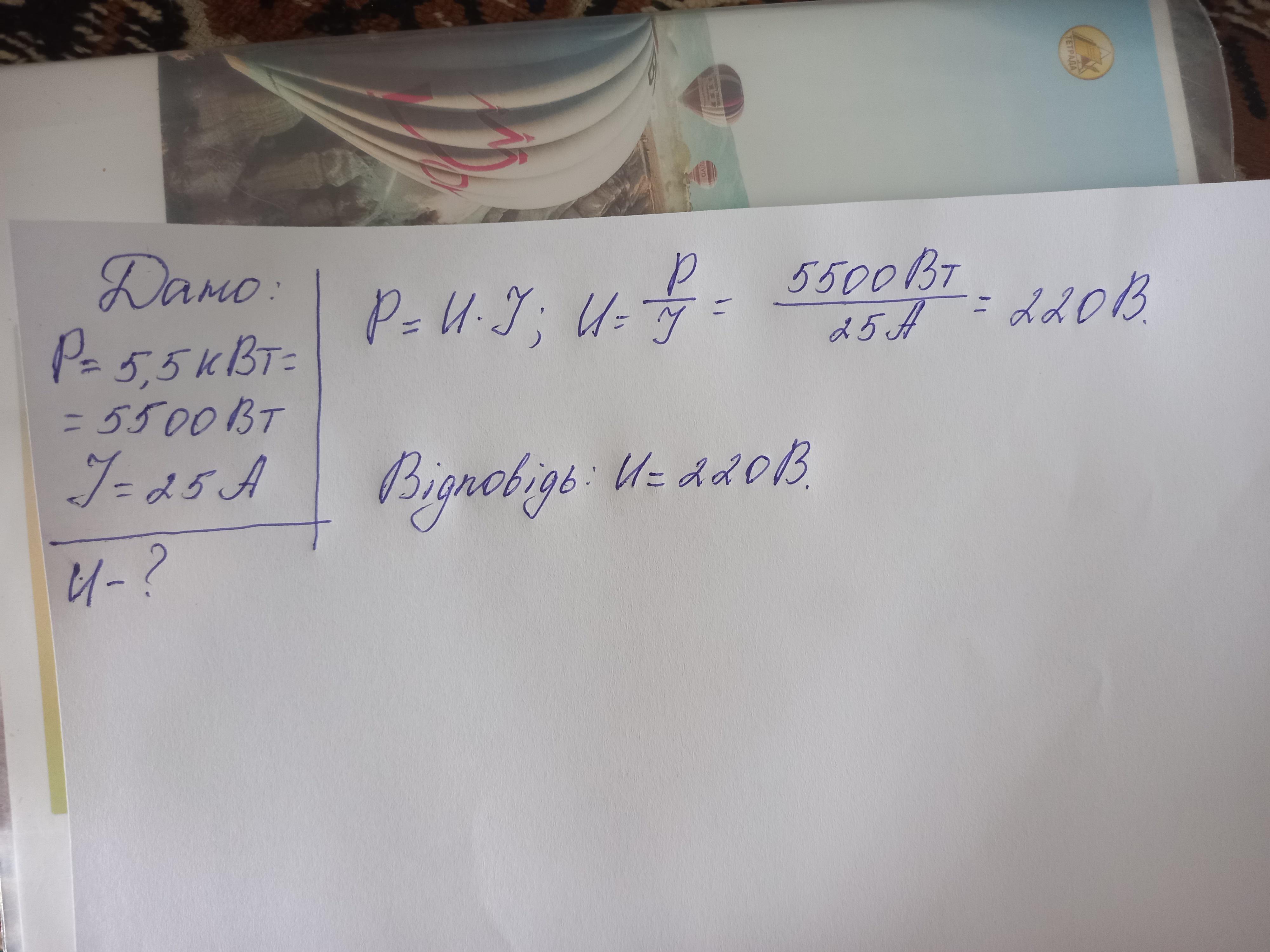 електрична піч споживає 5.5 кВт при силі струму 25 a.визначне напругу в мережі,яка живить електропіч
