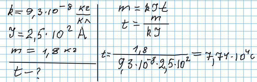 Скільки часу тривав електроліз, якщо при силі струму 250 А на катоді виділилося 1,8 кг