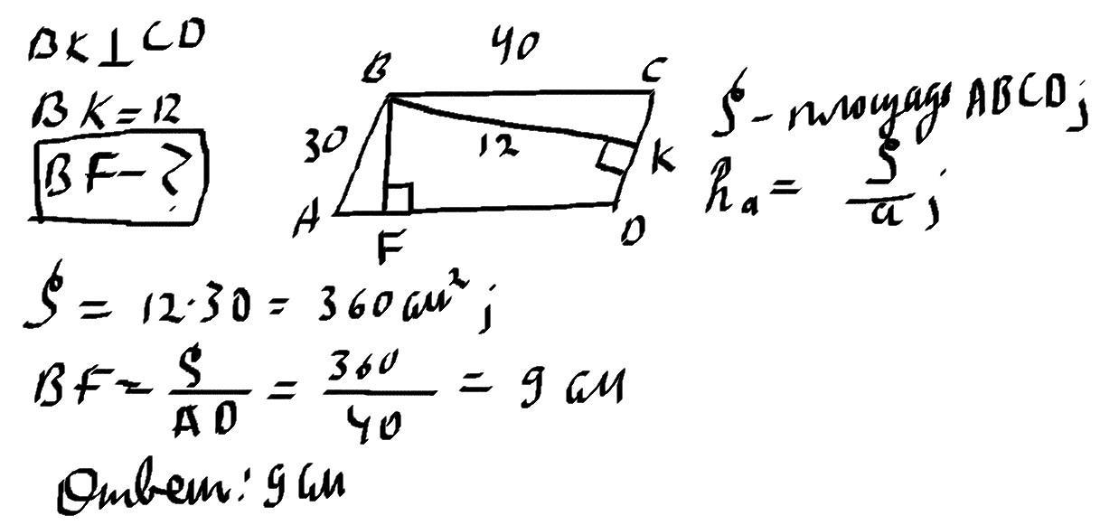 Сторони паралелограма дорівнюють 40 см і 30 см, а висота, проведена до меншої сторони, дорівнює 12 см. Знайдіть другу висоту.