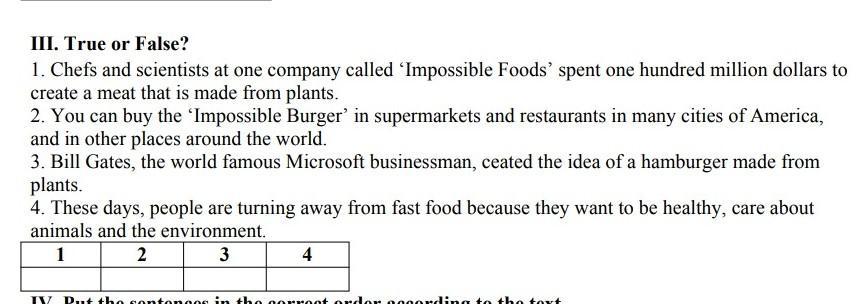 These days, people are turning away from meat because they want to be healthy, care about animals and the environment. For that reason, chefs and scientists at one company called 'Impossible Foods' spent one hundred million dollars to create a hamburger called the 'Impossible Burger'. It's called the 'Impossible Burger' because it looks, smells and tastes like a real meat burger, but it is made from natural plant ingredients such as wheat, coconut oil and potatoes. Where can you buy an Impossible Burger? Currently, you can buy it only in 32 restaurants in New York, Los Angeles, Las Vegas, Texas and San Francisco. However, the company plans to sell it in supermarkets and restaurants in many other cities in America, and then in other places around the world. The company says that it also wants to create other kinds of 'meat' that are made from plants. Bill Gates, the world famous Microsoft businessman, loves the idea of a hamburger made from plants. On January 7, 2019, 'Impossible Foods' launched a new version of their burger, the 'Impossible Burger 2.0'. The company has stated that the new burger is "tastier, juicier and more nutritious..." The new product is also gluten-free, replacing wheat with soy protein.