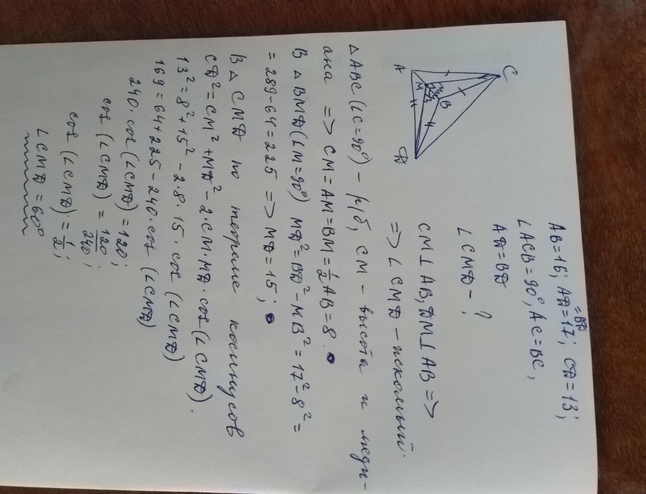 Рiвнобедренi трикутники мають спільну основу, довжиною 16 см. А їх площини утворюють кут 60º. Бічна сторона одного 17 см, а бічні сторони другого - взаємно перпендикулярні. Знайти відстань між площинами трикутників.
