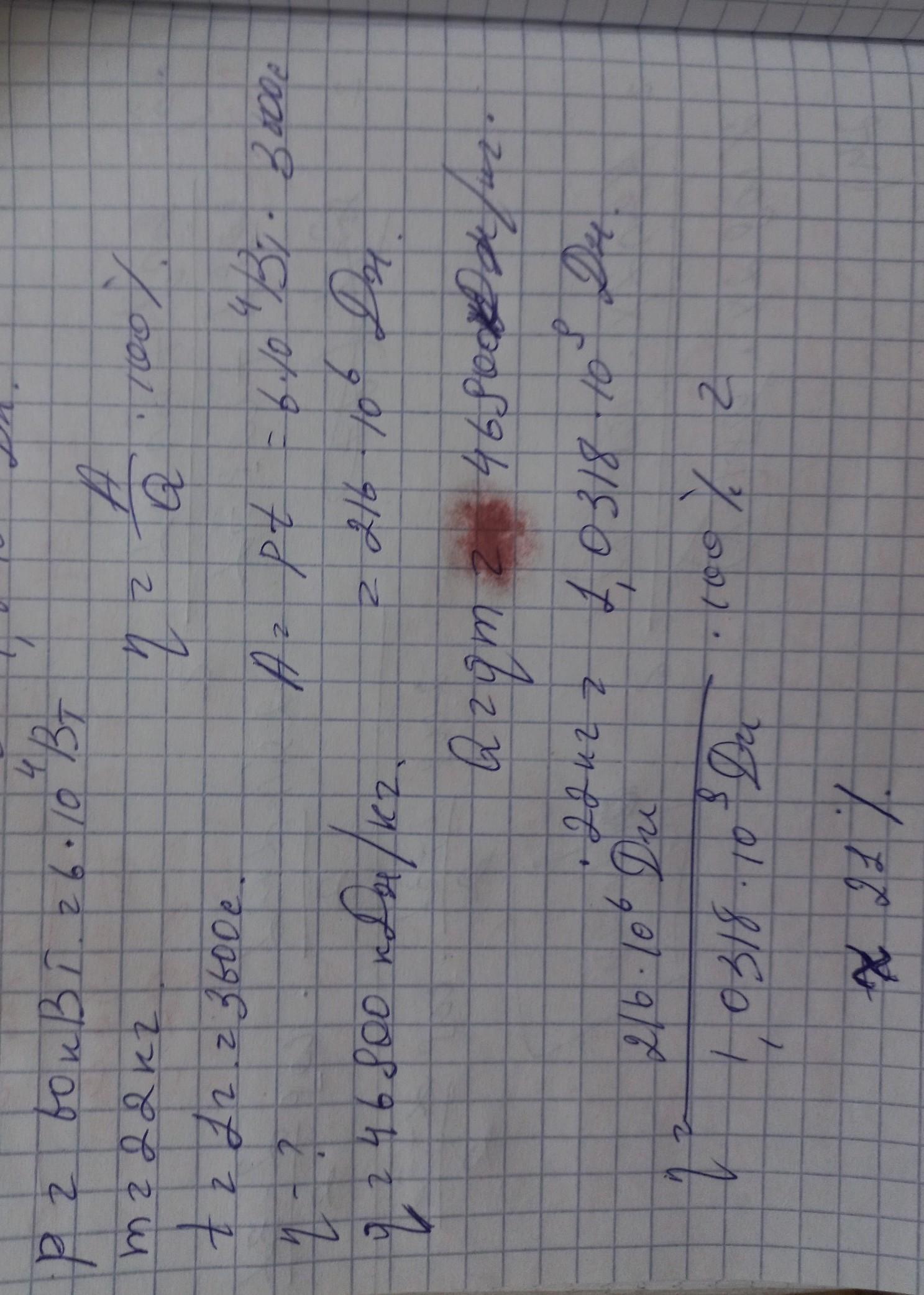 Автомобиль мощностью 60 кВт расходует 22 кг бензина в час. Определи КПД двигателя автомобиля. (Удельная теплота сгорания бензина q=46900 кДж/кг). Ответ (округли до десятых)
