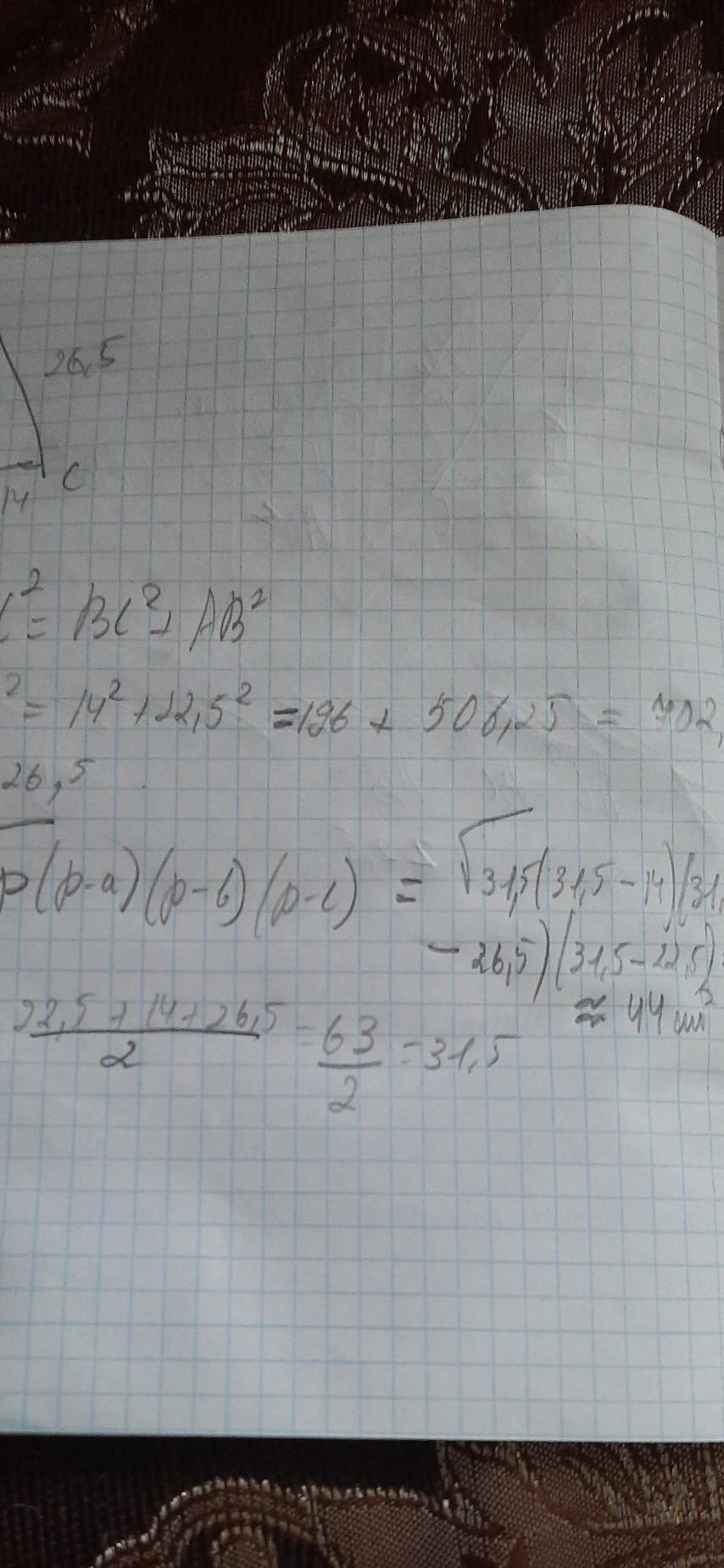 S=a*b/2=14*22.5/2=157.5кв.см.