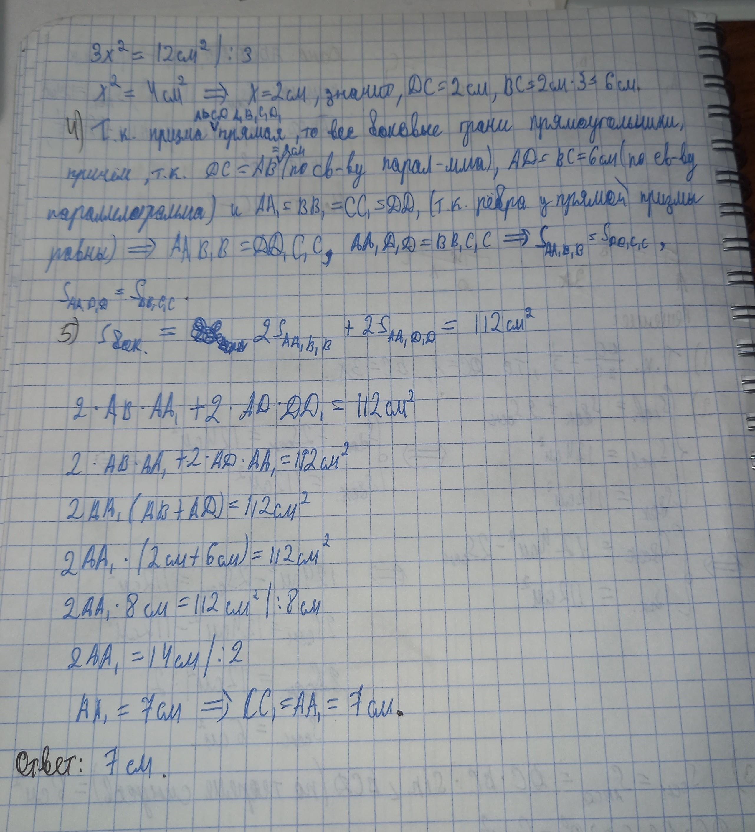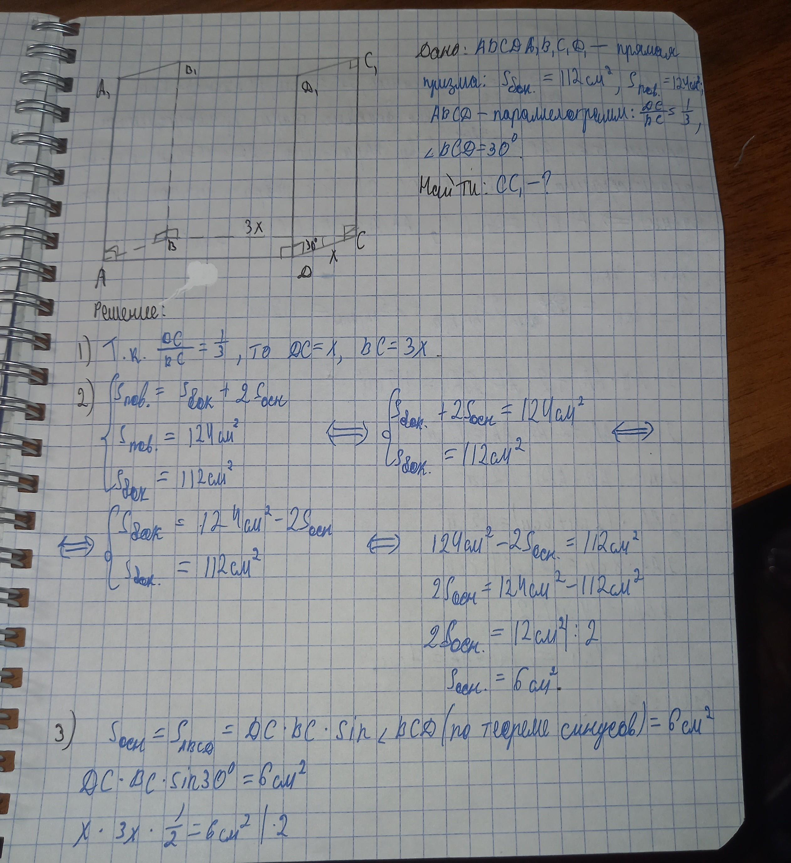 В основі прямої призми лежить паралелограм, сторони якого відносяться як 1:3, а кут між ними 30°. Площа бічної поверхні призми дорівнює 112 см2, а площа повної поверхні – 124 см2. Знайдіть висоту призми.