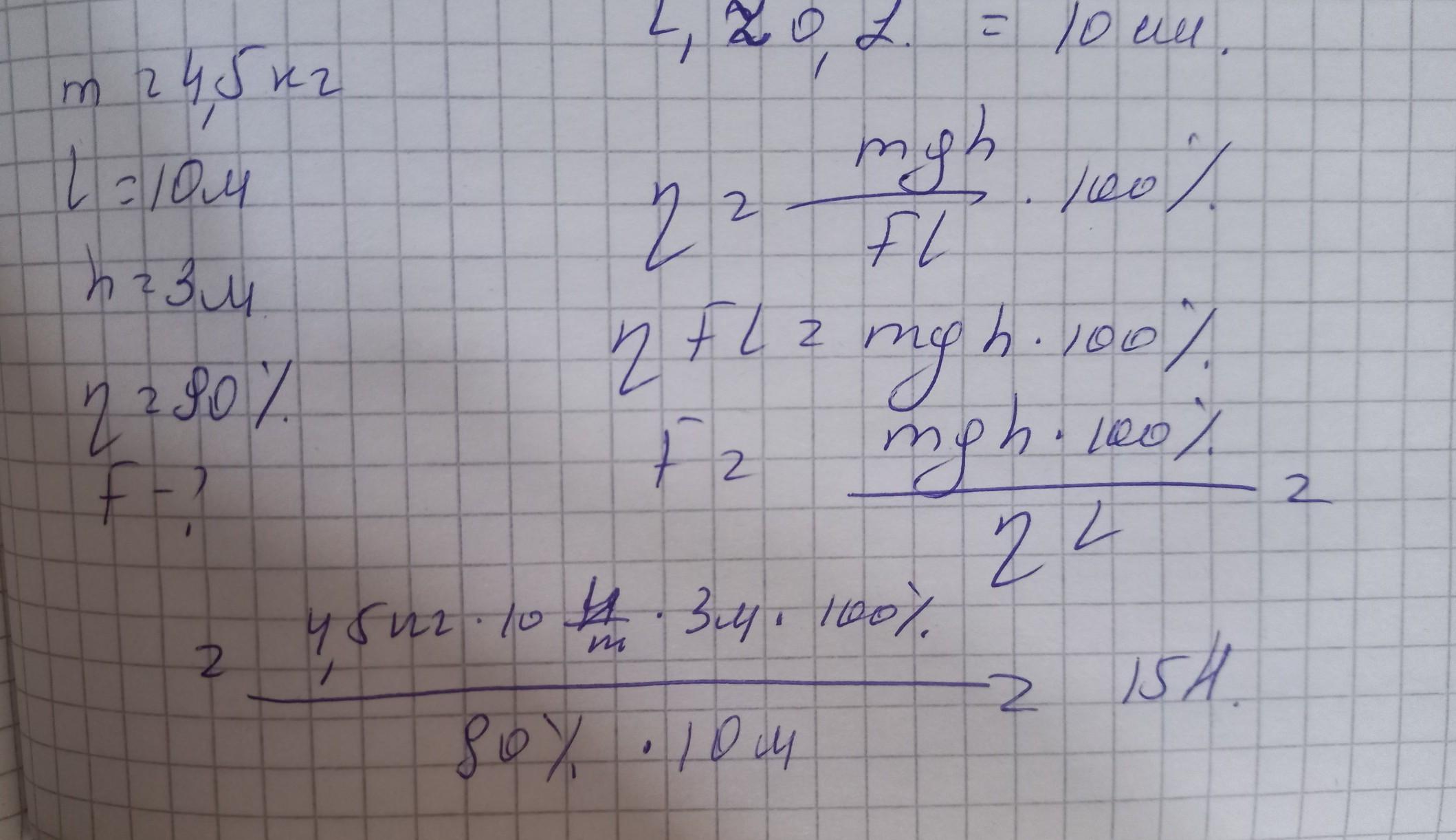 Хлопчик тягне на гірку санчата масою 4,5кг. Обчисліть силу, яку прикладає хлопчик, якщо довжина гірки 10м, висота - 3м, а ККД похилої площини 90%.