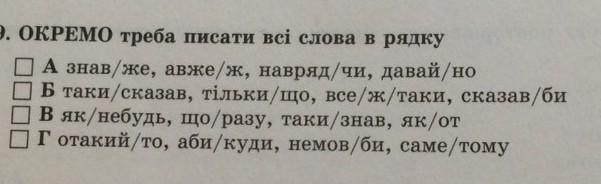 9. ОКРЕМО треба писати всi слова в рядку А) знав/же, авже/ж, навряд/чи, давай/но Б) таки/сказав, тільки/що, все/ж/таки, сказав/би В) як/небудь, що/разу, таки/знав, як/от Г) отакий/то, аби/куди, немов/би, саме/тому