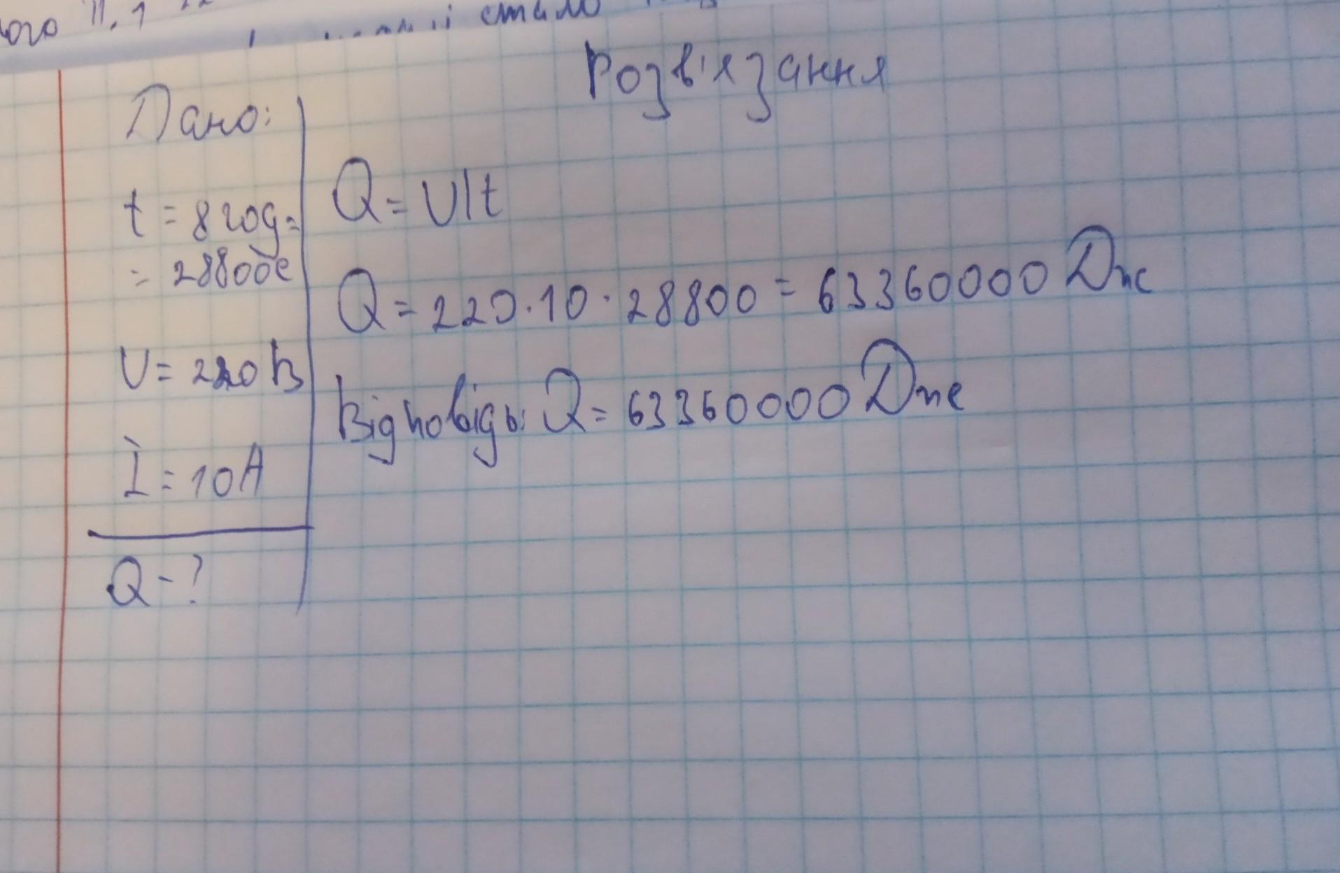 Яка кiлькiсть теплоти виділиться за 8 год в обмотці електричної печі, якщо сила струму в обмотці при напруці 220 В дорівнює 10 А?