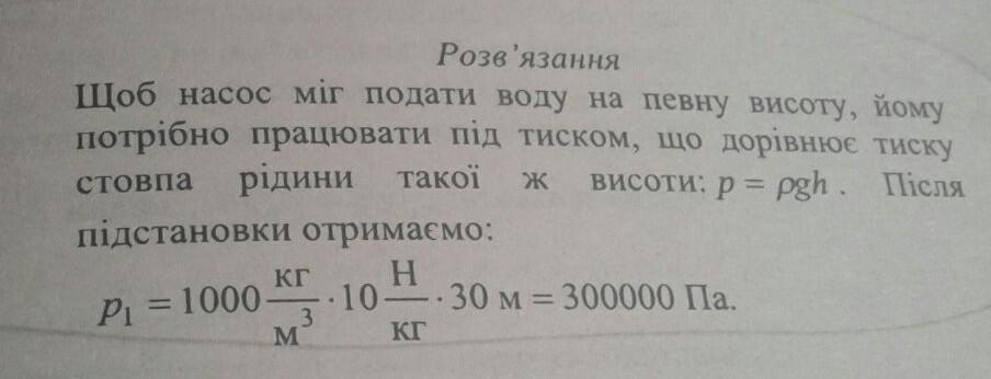 щоб насос міг подавати воду на певну висоту йому потрібно працювати під тиском що дорівнює тиску стовпа рідини такої ж висоти p-pgh.Після підстановки отримаємо 300000па