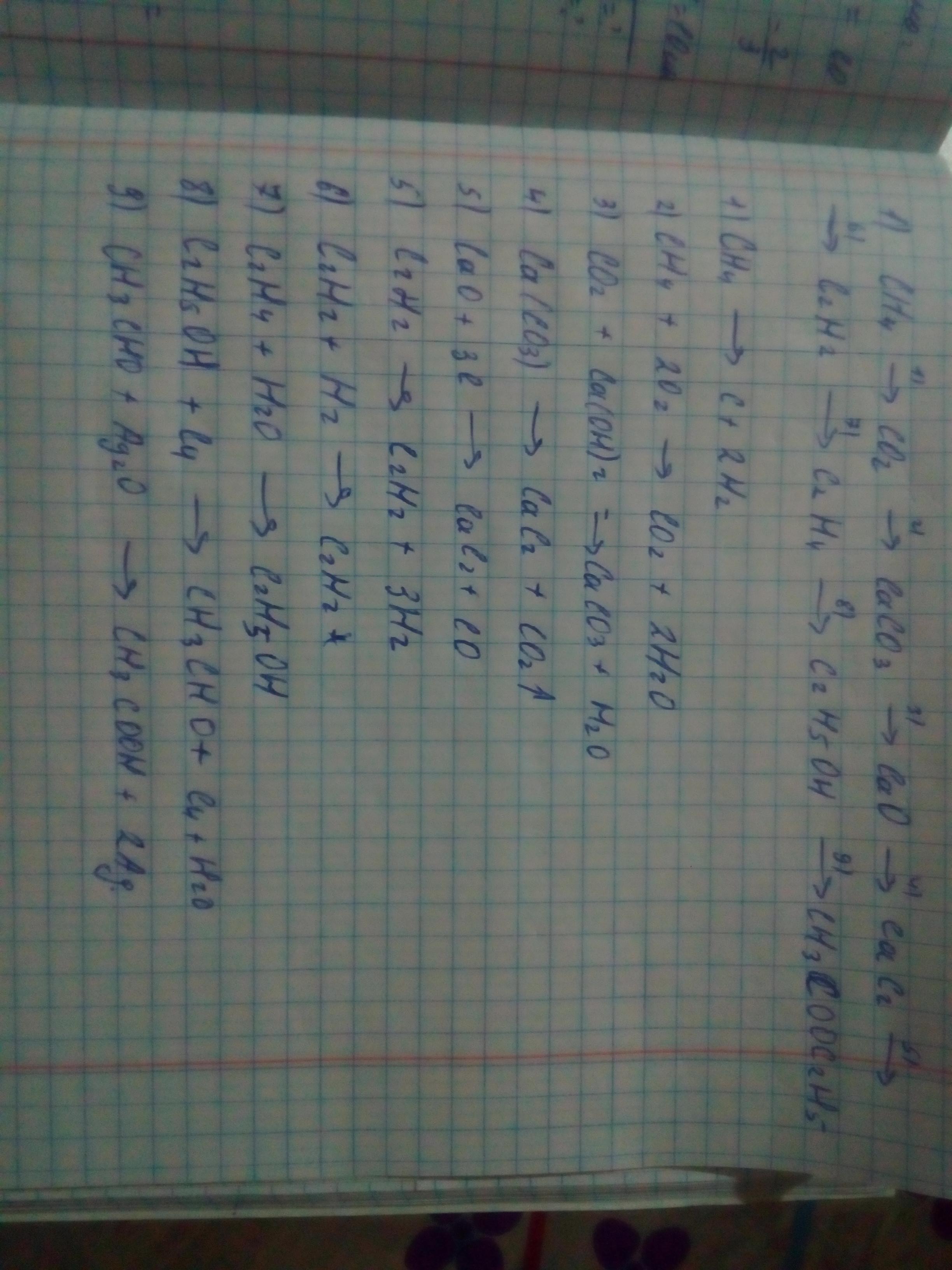 Здійснити перетворення (Осуществить преобразование) : CH4-CO2-CaCO3-CaO-CaC2-C2H2-C2H4-C2H5OH-CH3COOC2H5