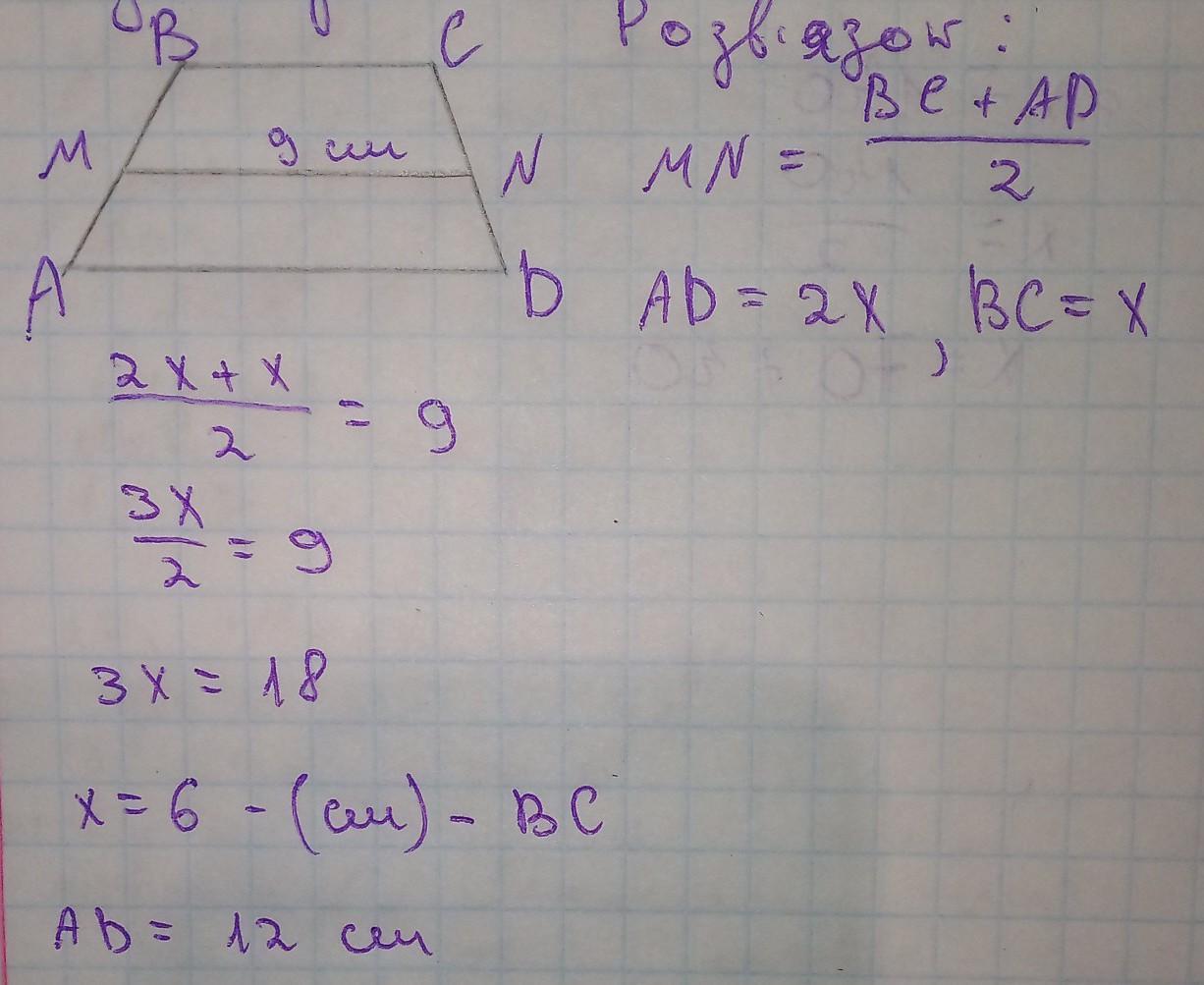 Знайдіть основи трапеції,якщо одна з них удвічі більша за іншу,а середня лінія трапеції дорівнює 9см.