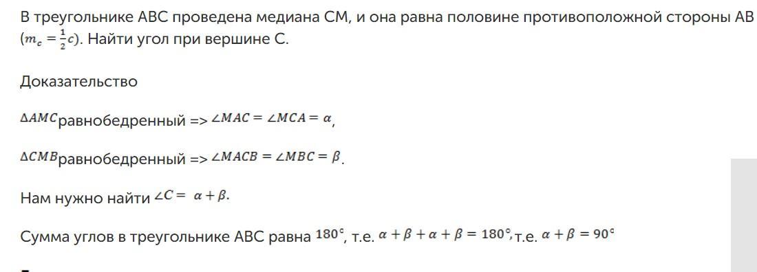 соответственно треугольник прямоугольный и угол при вершине С = 90 градусов