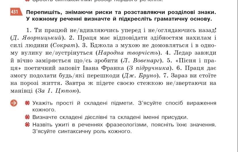 Ти працюй не вдивляючись уперед і не оглядаючись назад! Праця, має відповідати здібностям, нахилам і силі людини. Бджола з мухою не домовляються, і в вулику не зустрінуться. Ледар завжди, й вічнозаміряється щось робити. "Пісня і праця"- поетичний заповіт Івана Франка. Праця дає змогу подолати будь-які перешкоди. Зараз, ви, стоїте на порозі життя. Завтра ,ж , підете своєю стежкою не звертаючи на манівці
