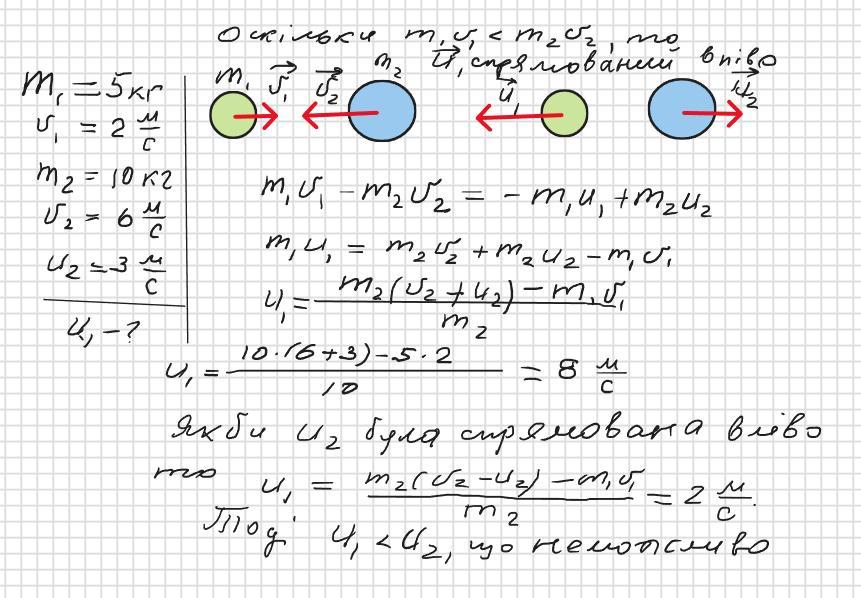 Дві кулі масами 5кг та 10кг рухаються назустріч одна одній зі швидкостями 2м/с та 6м/с. Яка швидкість легшої кулі після удару, якщо важча рухатиметься зі швидкістю 3м/с ? Куди рухатиметься легша куля?