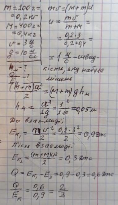 Ніж масою 200 г кидають З горизонтальною швидкістю 3 м/с у мішень масою 400 г, що підвішена на мотузках. Мішень разом з ножом, що в ній застряє, піднімається на деяку висоту. Визначте частину механічної енергії, яка перетворюється у внутрішню.
