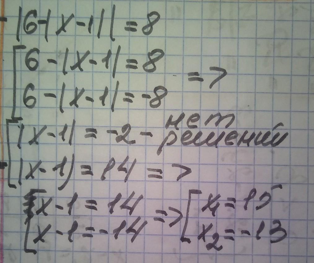 6+|x-1|=+-8; |x-1|=+-8-6; |x-1|=-14; нет решений; |x-1|=14; x-1=+-14; x=1+-14; x1=-15; x2=-1
