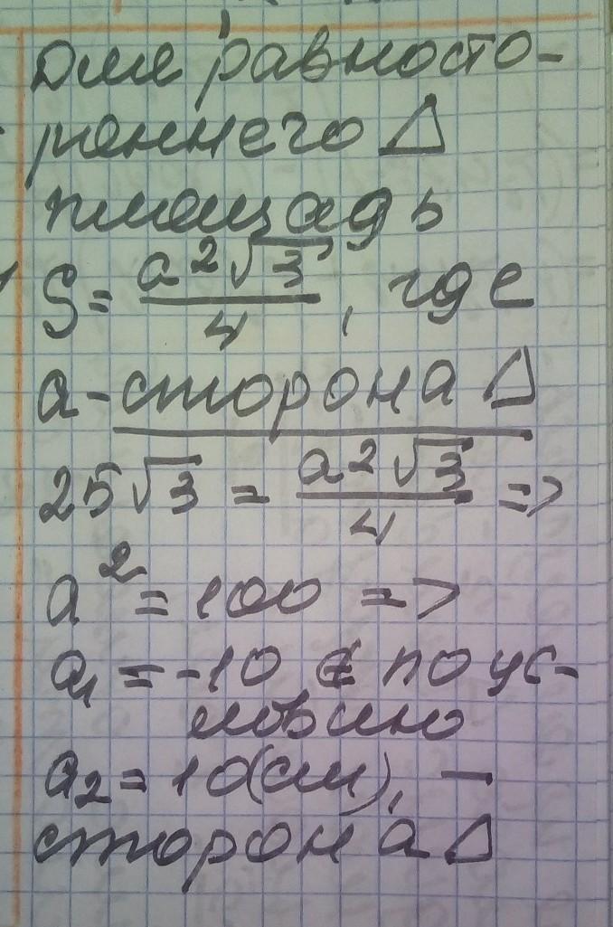 Знайти сторону рівностороннього трикутника, якщо його площа 25√3 см²